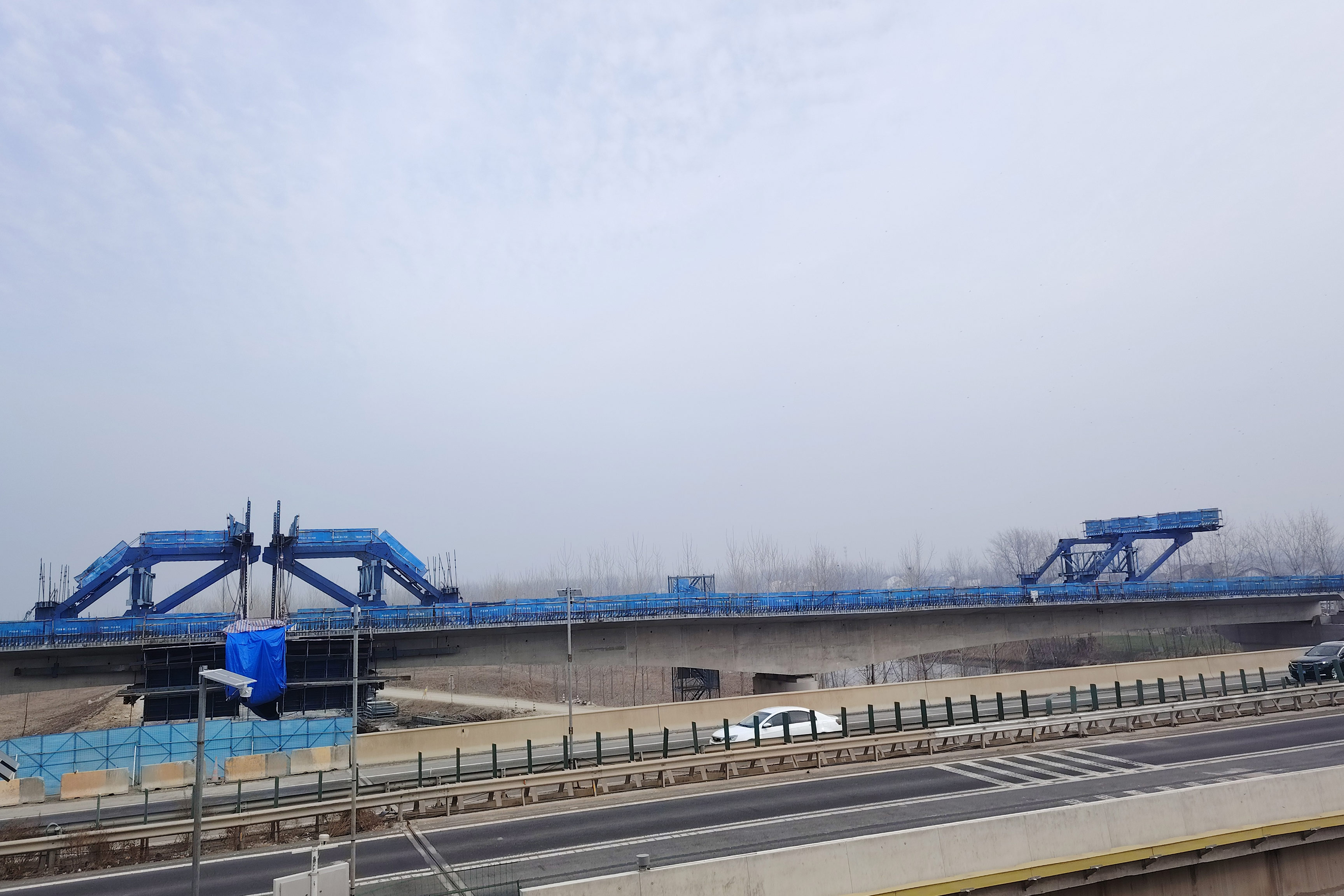 新沂河特大桥采用左右幅分离式设计,4联主桥的挂篮施工是项目核心控制性环节。为确保工程顺利推进,项目部前期组织技术骨干反复研讨,结合现场水文地质条件优化施工方案,多次模拟挂篮移动、混凝土浇筑等关键工序,精准把控施工细节;同时主动加强与水利、交通等部门及地方政府的协调,妥善解决交叉作业干扰问题,为施工创造有利条件。在安全与技术保障方面,项目部常态化开展安全、技术交底会,对施工人员进行专项培训,明确各工序操作规范与安全注意事项,并在挂篮作业区域安排专人24小时巡视监测,实时掌控梁体线型与结构受力情况。针对冬季低温天气,项目部针对性采取保温防护措施,确保混凝土施工质量。
