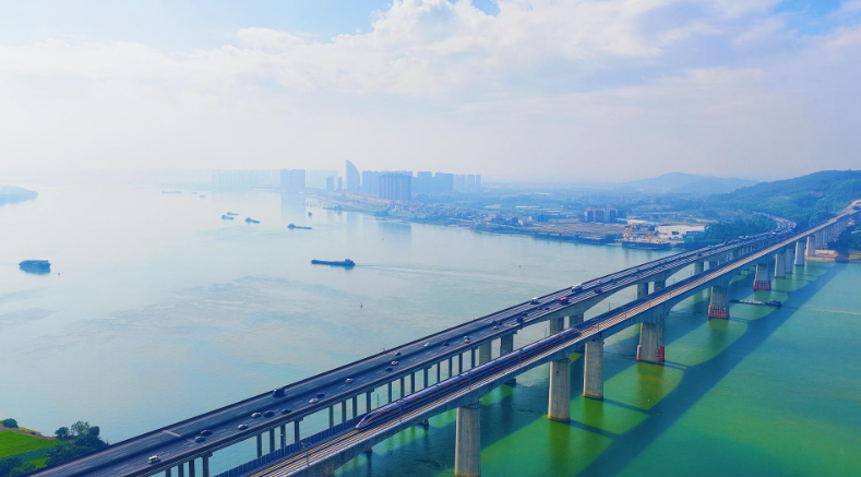 佛山特大桥跨西江主桥是全线施工难度最大的桥梁,以(109+200+200+109)米的孔跨布置,创下世界最大跨度时速350公里无砟轨道钢混混合连续刚构桥的纪录。